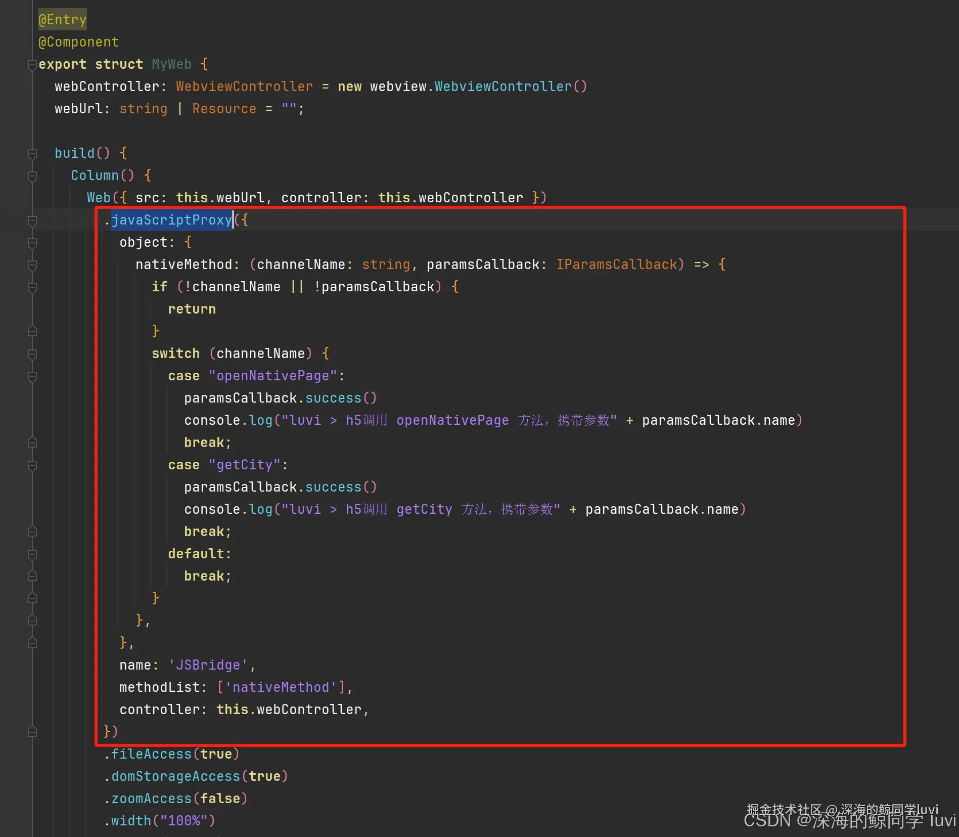 在原生代码侧使用 javaScriptProxy 方法向 h5 的 window 对象中注册方法,此处我注册的对象名叫 JSBridge ,在该对象中写入了一个 nativeMethod 方法,h5 中直接调用 nativeMethod() 方法即可向原生发送消息。