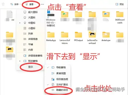 在“此电脑”中打开硬盘,然后点击文件资源管理器上的“查看”,滑到下面将箭头放在“显示”上,最后就能点击“隐藏的项目”了。