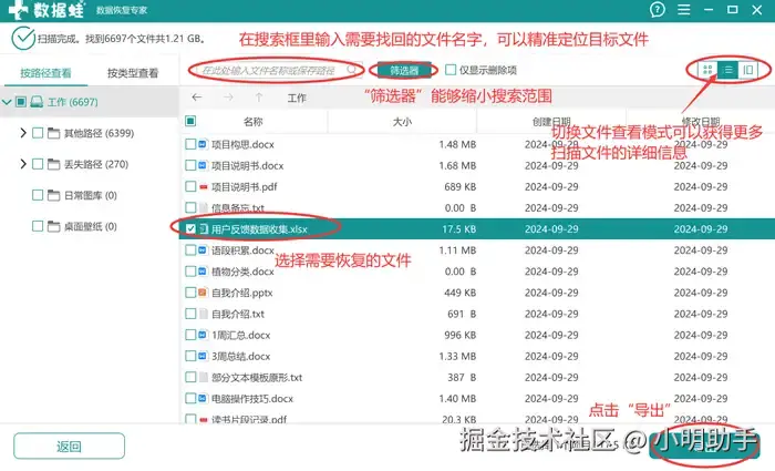 步骤2: 用户可以选择使用“搜索框”、“筛选器”等工具帮助自己更快找到需要恢复的硬盘文件,找到后点击“导出”,然后再选择文件存放的新位置即可。