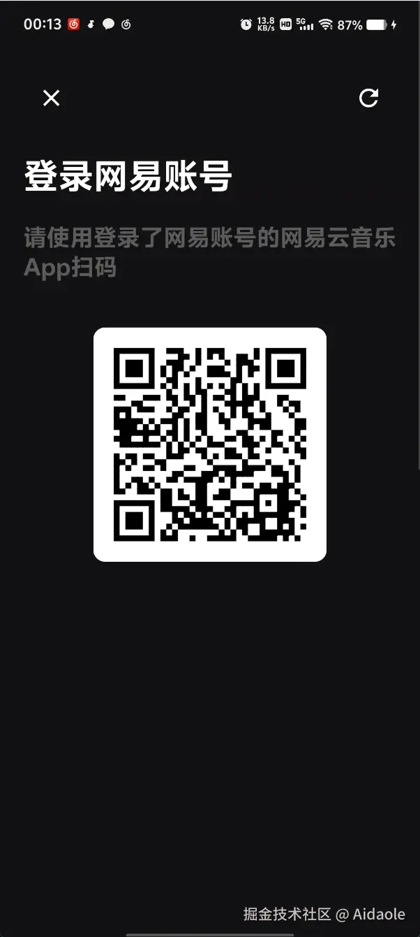 - 登录,包含账号密码登录(失效),验证码登录(失效), 二维码登录(可用, 使用网易云音乐扫描二维码登录)