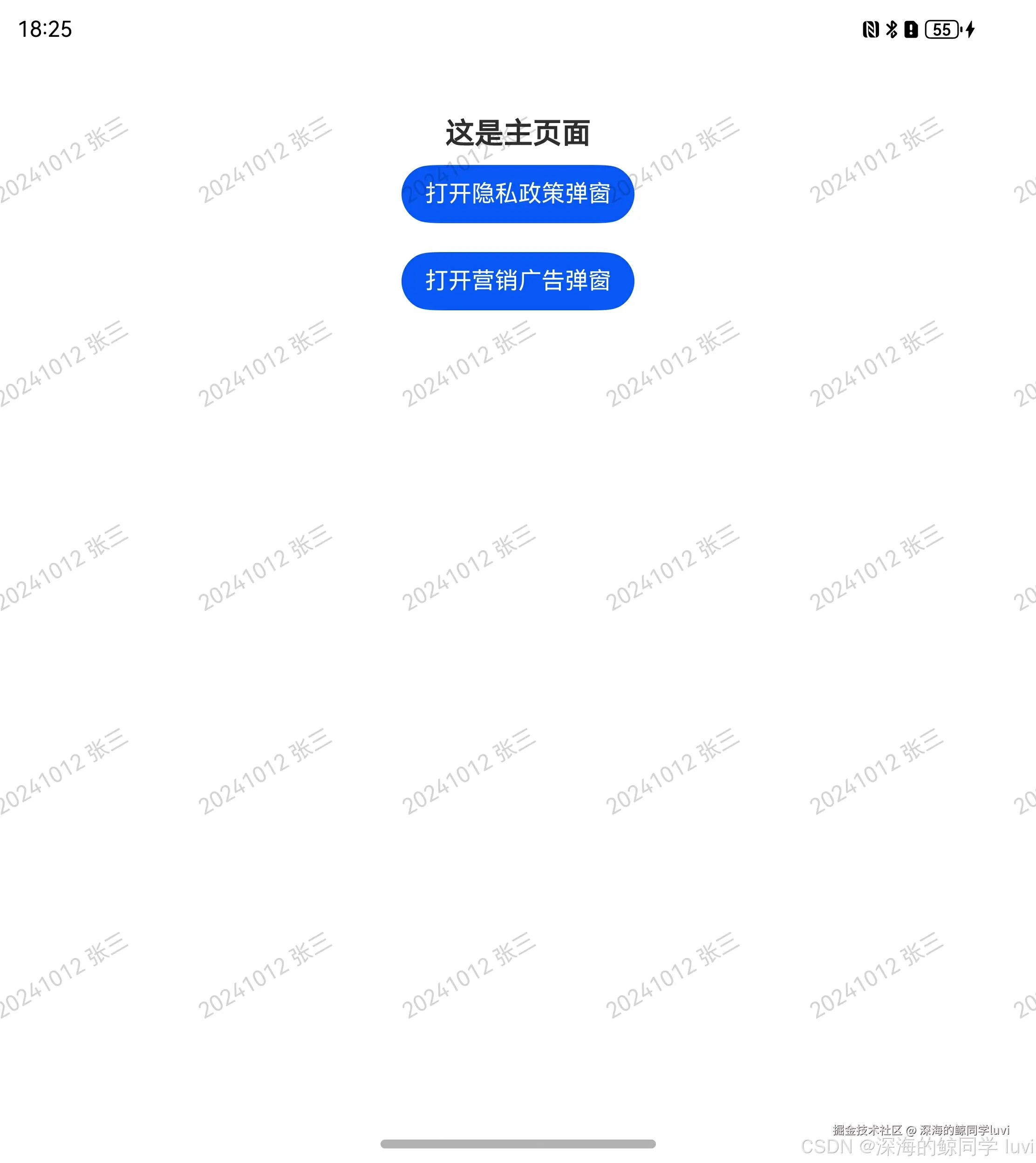 本期文章代码比较简单,核心逻辑为 ①对触摸事件的穿透控制,②组件 .overlay() 浮层的使用,可自行修改 Watermark() 构建函数代码调整至自己业务所适合的样式。