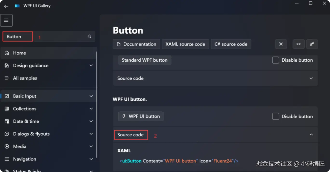 可以打开WPF UI Gallery,搜索 Button,找到想要使用的样式,点击Source Code,如下所示: