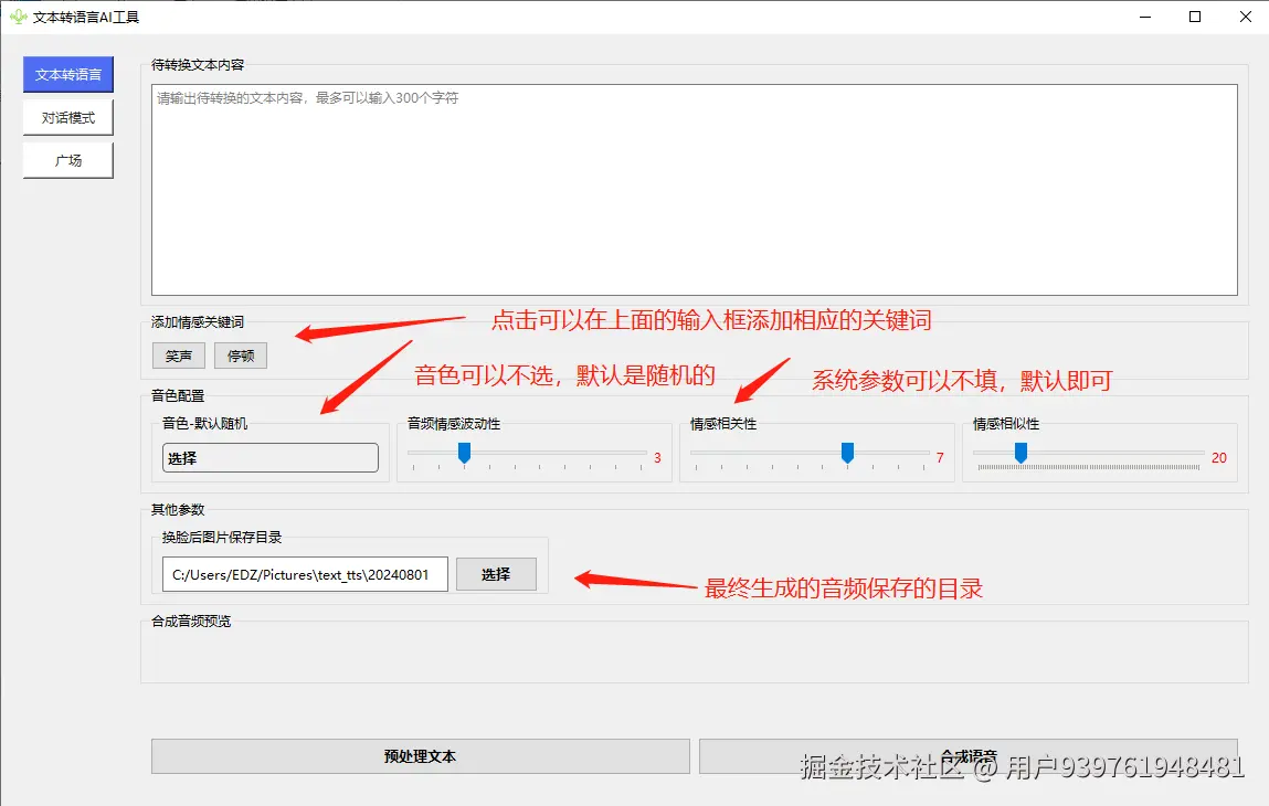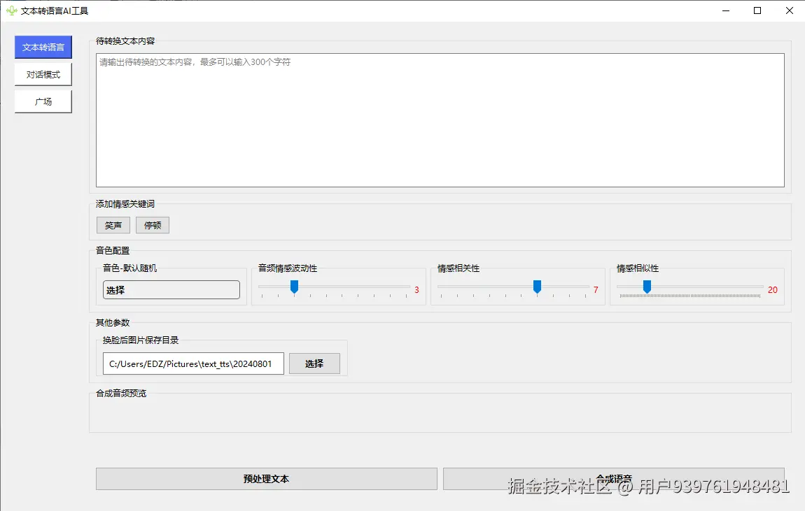 应用启动之后,我们就可以填写待转换语音的文本,音色。关于音色,大家可以在广场那里查看全部音色,官方提供了上前个已经克隆好的音色,足够我们日常工作使用。