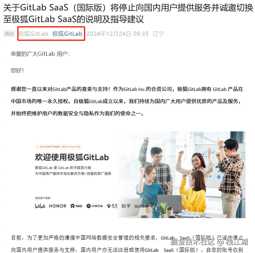 2024年12月24日,极狐GitLab 官方公众号发布了个说明。