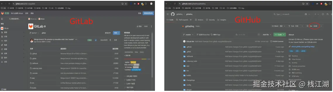 这两个仓库都包含了 GitLab 的核心代码,gitlab.com 上是官方版本,而 github 上的版本是GitLab CE 的镜像版本。可以看到 github8 小时前还有一次Commit:“ Add latest changes from gitlab-org/gitlab@master”。