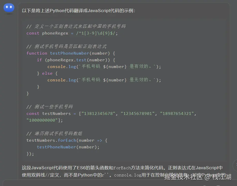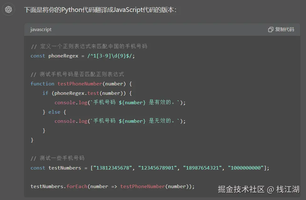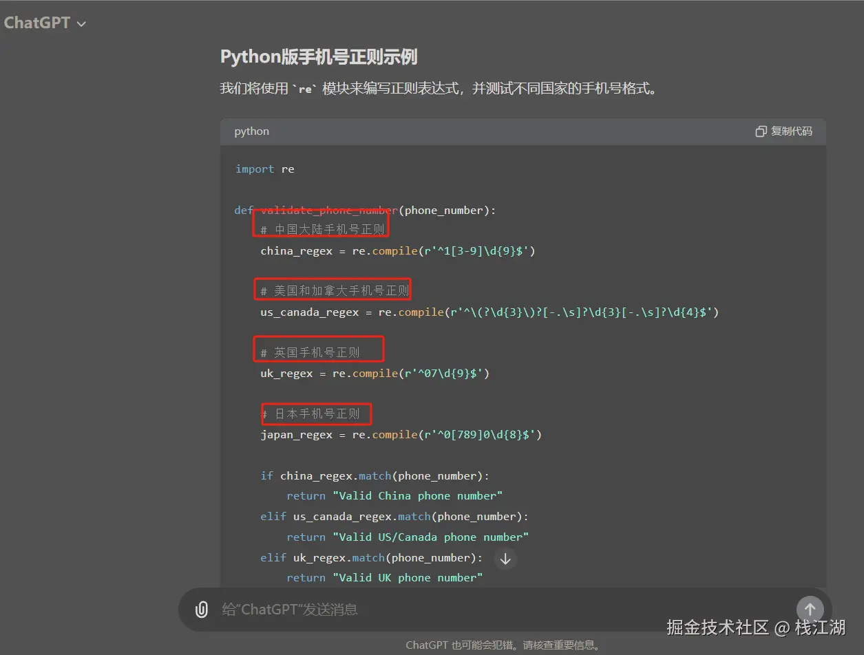 和KIMI类似生成相应的正则代码,不过chatgpt默认会生成不同国家的手机号格式的正则