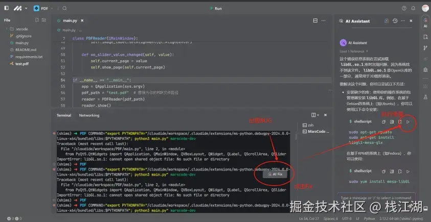 当运行程序出现bug后,“AI Fix”图标会自动出现,点击后会可以通过AI生成相应的解决方案,解决方案里也会有相应的按钮半自动化的处理,非常的方便。