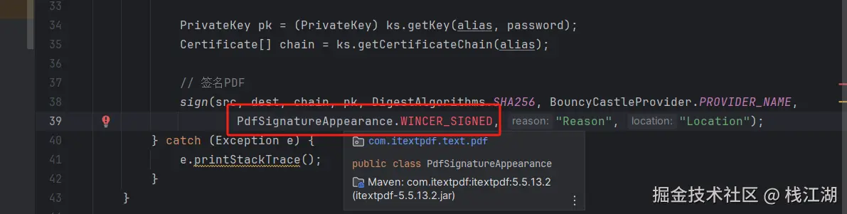 然后还是会发现PdfSignatureAppearance是没有WINCER_SIGNED枚举。一般来说就是引用的版本不对,说明itext生成的代码依赖与代码是不对称的。