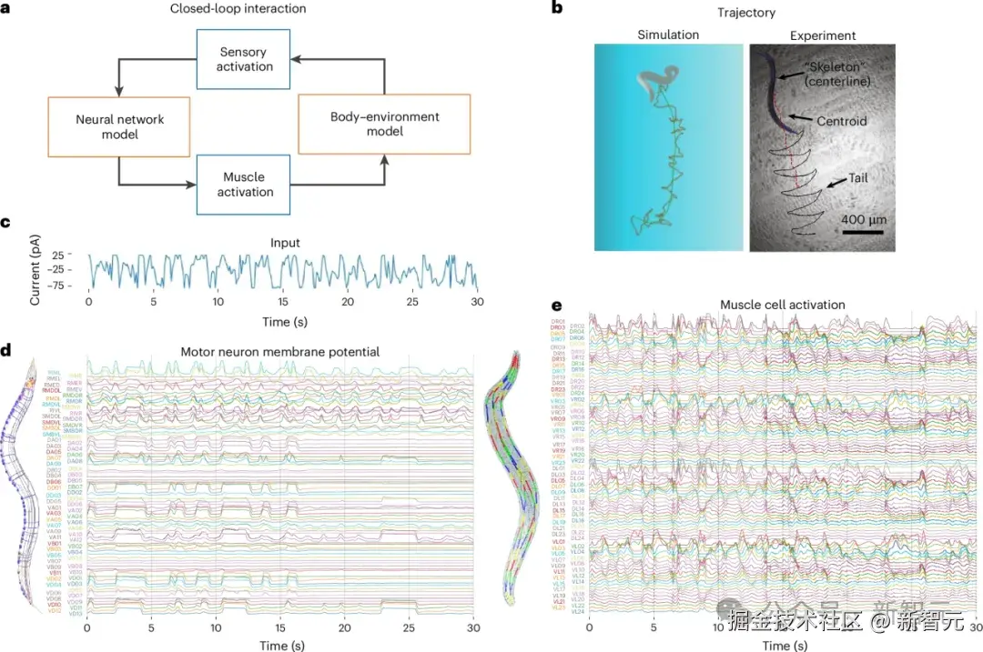 系统也简化模拟了环境中的连续感官输入(如食物浓度梯度)。这些输入会动态影响神经计算,进而驱动肌肉收缩,形成一个闭环反馈系统,形成协调的运动轨迹,能够与真实线虫行为类比(见图 1)。