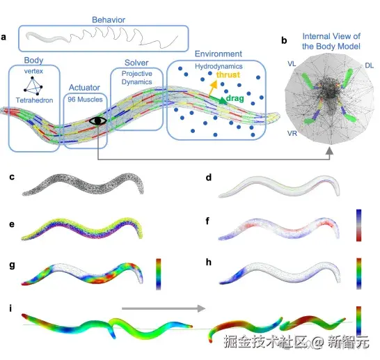 身体模型则结合了 96 个肌肉细胞,这些肌肉细胞基于秀丽隐杆线虫的解剖学,在四个象限中建模,以实现计算对称性。表面级的力模拟了推力和阻力,优化了计算效率,同时反映了生物体在流体环境中的互动特性。