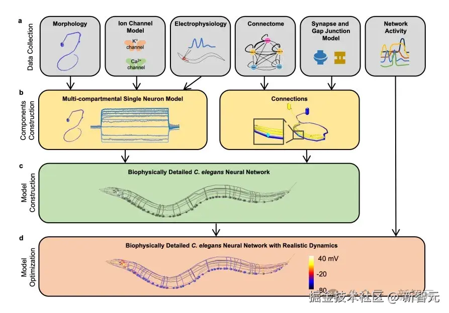 研究团队基于线虫神经元的真实生理特性,构建了一个生物物理层面上的高精度神经网络模型。神经网络模型中的每个神经元都被表示为一个多舱室模型,模拟神经元的结构和功能部分(如胞体、神经突),以精确复现秀丽隐杆线虫神经元的电生理特性以及基于实验数据的精细突触和间隙连接结构。该模型是目前已知首个同时在神经元层面和神经网络层面都具有真实动力学特性的,基于多舱室建模的高精度秀丽隐杆线虫神经网络模型。