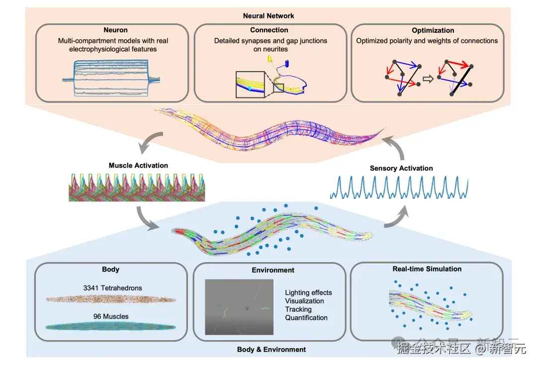 图 1:BAAIWorm 天宝是一个具身秀丽隐杆线虫仿真平台。BAAIWorm 天宝将一个生物物理层面非常精细的神经网络模型与一个生物力学身体和三维环境整合在一个闭环系统中,进行感官刺激和肌肉信号的交互。神经网络模型包含了具有精细结构的神经元模型及突触和间隙连接,通过迭代优化模型参数(如连接权重,连接极性等),逼近真实秀丽隐杆线虫的神经动力学特性。身体模型由 3,341 个四面体(作为身体结构的基本建模元素)和 96 个肌肉组成,与三维环境互动,实现实时的运动仿真。