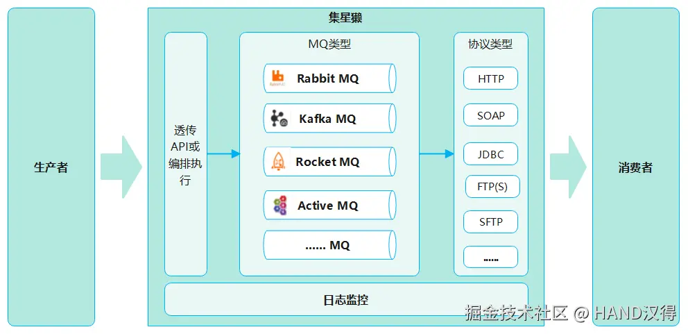 通过集星獭,可集中管理对个MQ对接,减少系统间的耦合度,简化整体架构,降低维护成本。消费者可根据实际情况选择相应的协议类型处理消费消息,并且在消息处理过程中,有完整的日志监控记录,方便运维排查问题。