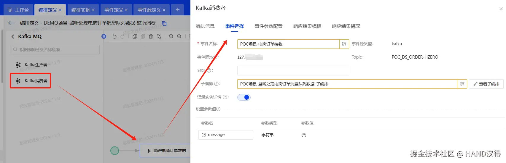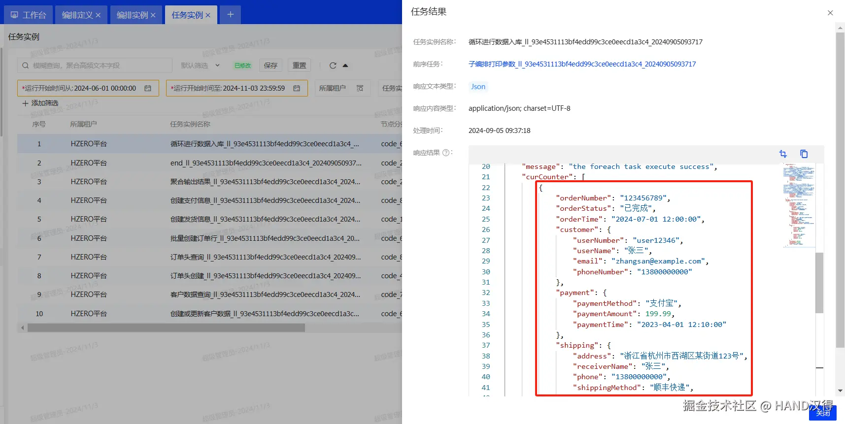 下图为Kafka消费者编排运行后生成的编排实例,点击任务实例,可查看到监听的消息以及触发的子编排流程。