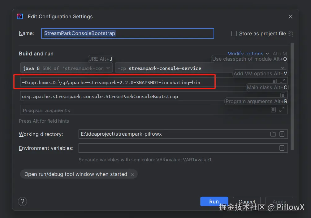 勾选Add VM options,填写参数-Dapp.home=$path,$path是我们刚刚复制的路径