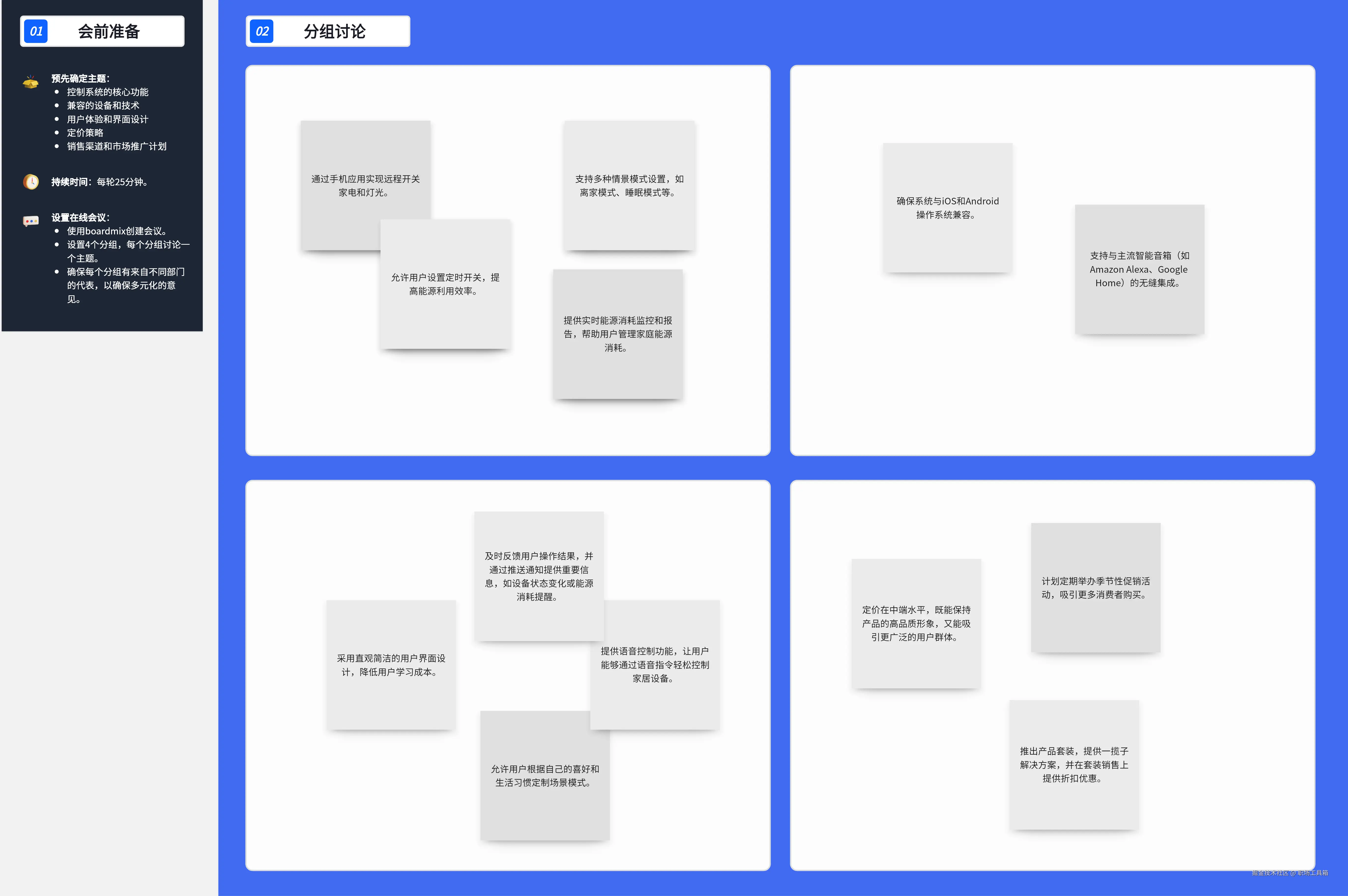 智能家居控制系统线上头脑风暴会议模板集结了专家、技术人员和产品经理的智慧,探讨和解决智能家居系统中的问题,提出新想法和改进方案。这个模板推动智能家居技术的创新和发展,为用户提供智能和便捷的生活体验。