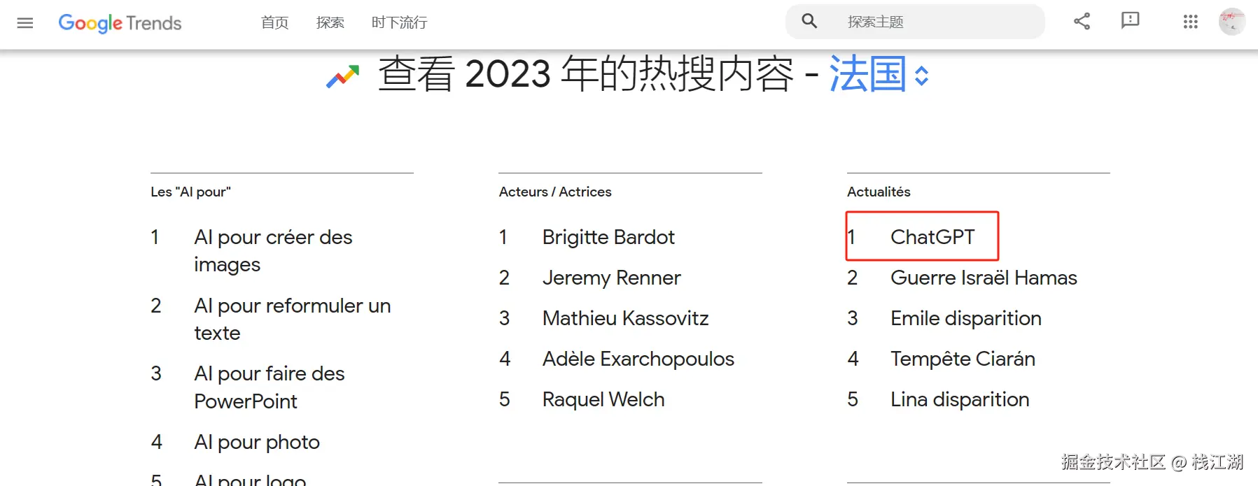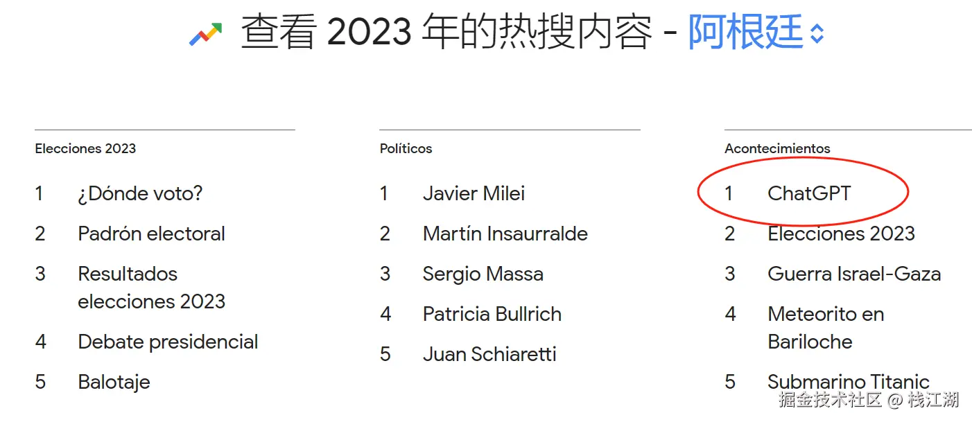 上面列举了一些国家的热搜内容排行榜,ChatGPT、OpenAI成为2023年度的热搜词。