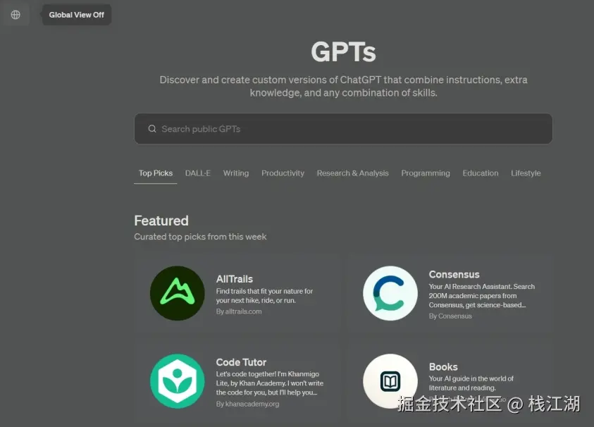 同时推出了GPTs的概念,GPTs是一种可以定制的ChatGPT版本,可以把GPTs想象成一种智能的软件,它可以根据您的需求和场景,来执行不同的任务,比如写文章、做图表、生成音乐等等。