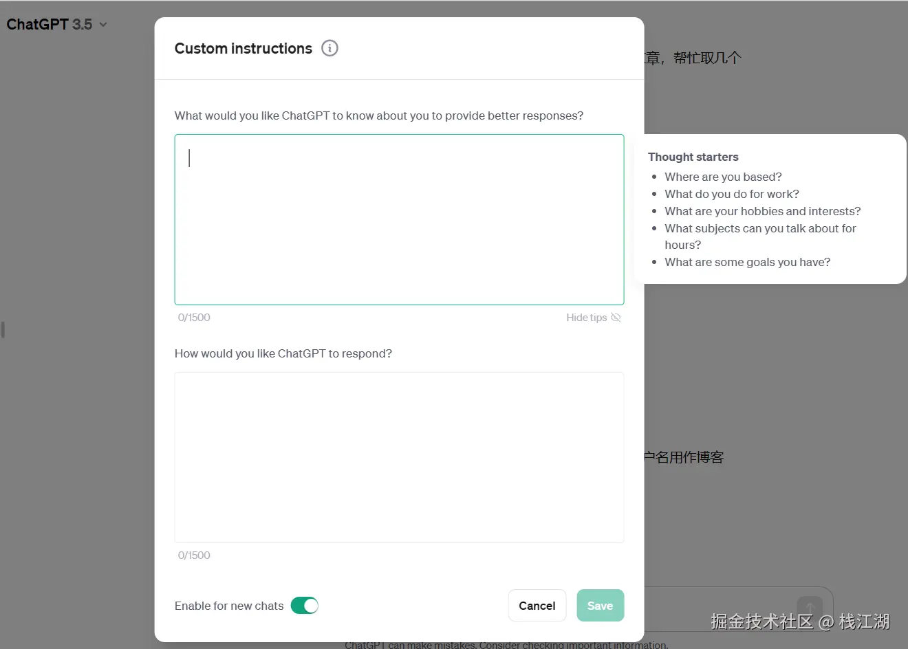 2023年7月,上线Custom Instructions功能,此功能通过为您的聊天提供具体的详细信息和指南来自定义您与 ChatGPT 的互动。每当您编辑自定义说明时,这些说明都会在您创建的所有新聊天中生效。现有聊天不会更新。