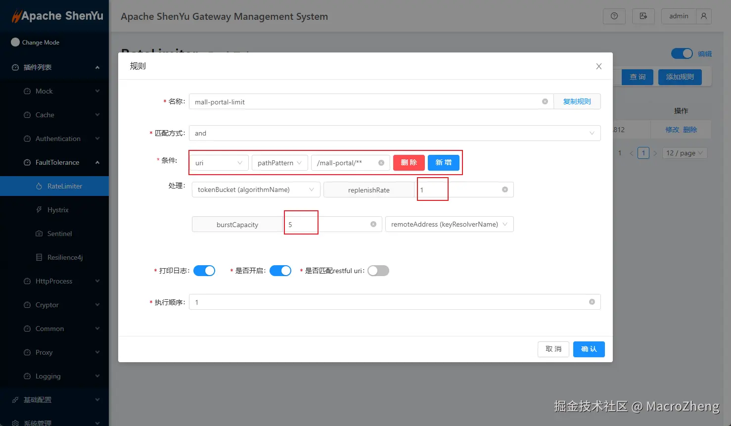 - 之后添加限流规则,这里我们采用了Redis令牌桶算法进行限流;