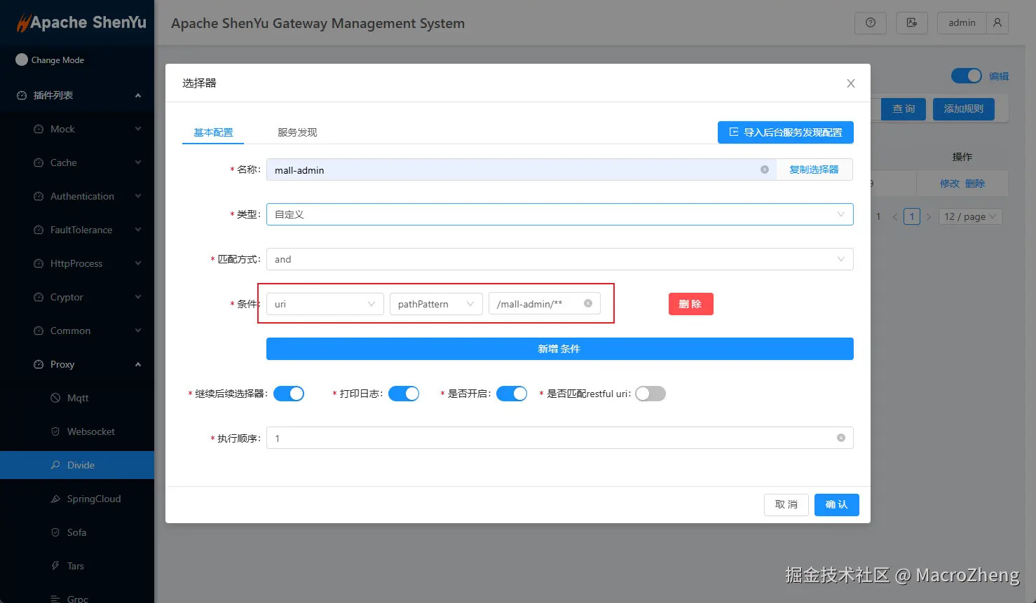 插件列表->Proxy->Divide功能中先添加选择器,这里以mall-admin为例,首先是基本配置;