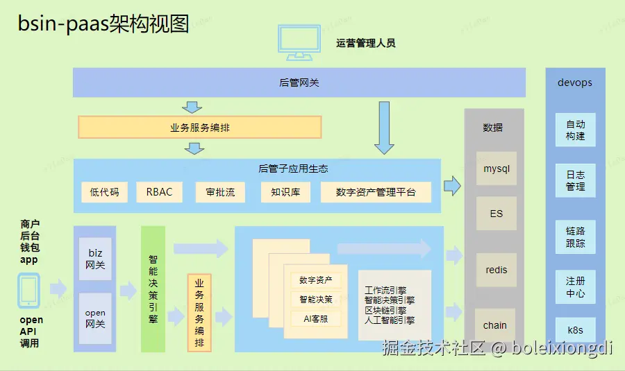 Bsin-PaaS(毕昇) 是一套企业级的低代码、零代码去中心化应用搭建平台,可帮助企业快速搭建基于云原生的有竞争力的业务中台,智能决策中台、流程中台、企业AI知识库、业务前台。bsin-paas包括微前端设计、微服务框架、服务编排、工作流引擎、安全网关及区块链引擎。该方案由区块链(公链、联盟链)作为技术支撑,为企业提供daPaaS层的一站式解决方案,助力企业打造数字经济底层技术架构,构建一套开放式和生态化的技术体系。作为一个平台,Bsin-PaaS本身拥有自己的数字资产,以用户为中心,实现让价值掌握在拥有者手中,帮企业构建一种全新的数字化商业生态模式。。