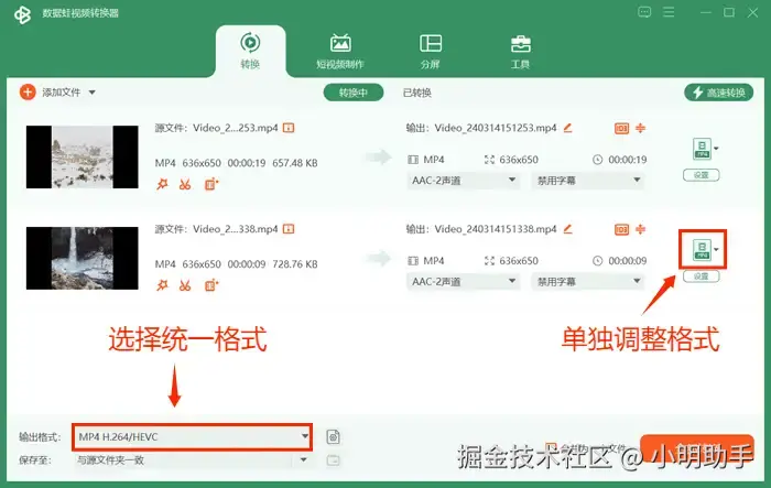 第二步: 可以点击左下角【输出格式】旁边的长框选择统一的输出格式,也可以点击视频对应的右侧绿色图标单独设置输出格式。