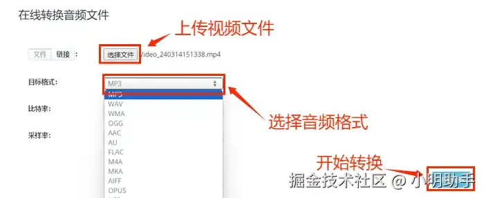 第三步: 点击【选择文件】上传视频文件,然后选择自己需要的目标音频格式。