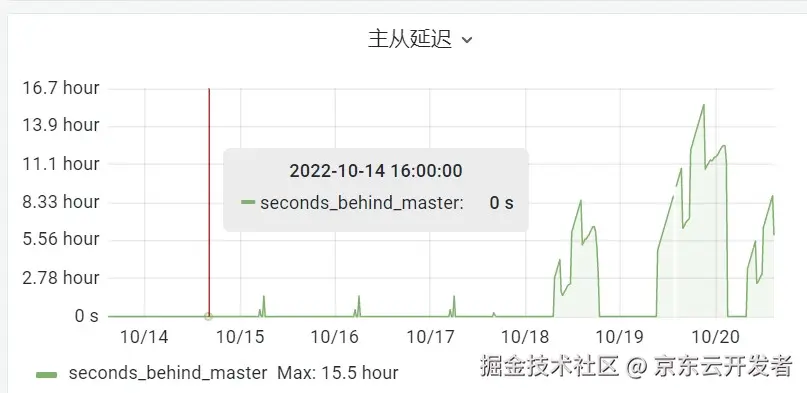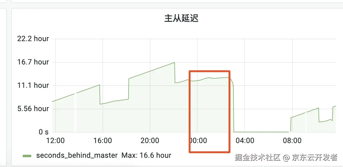 排查过程: 通过分析,发现大数据抽数的时候数据库从库数据1500W少了,但主库数据没少,主库数据是2800万。通过查看数据库监控,发现是主从延迟较长,延迟11小时(当时没配主从延迟报警)