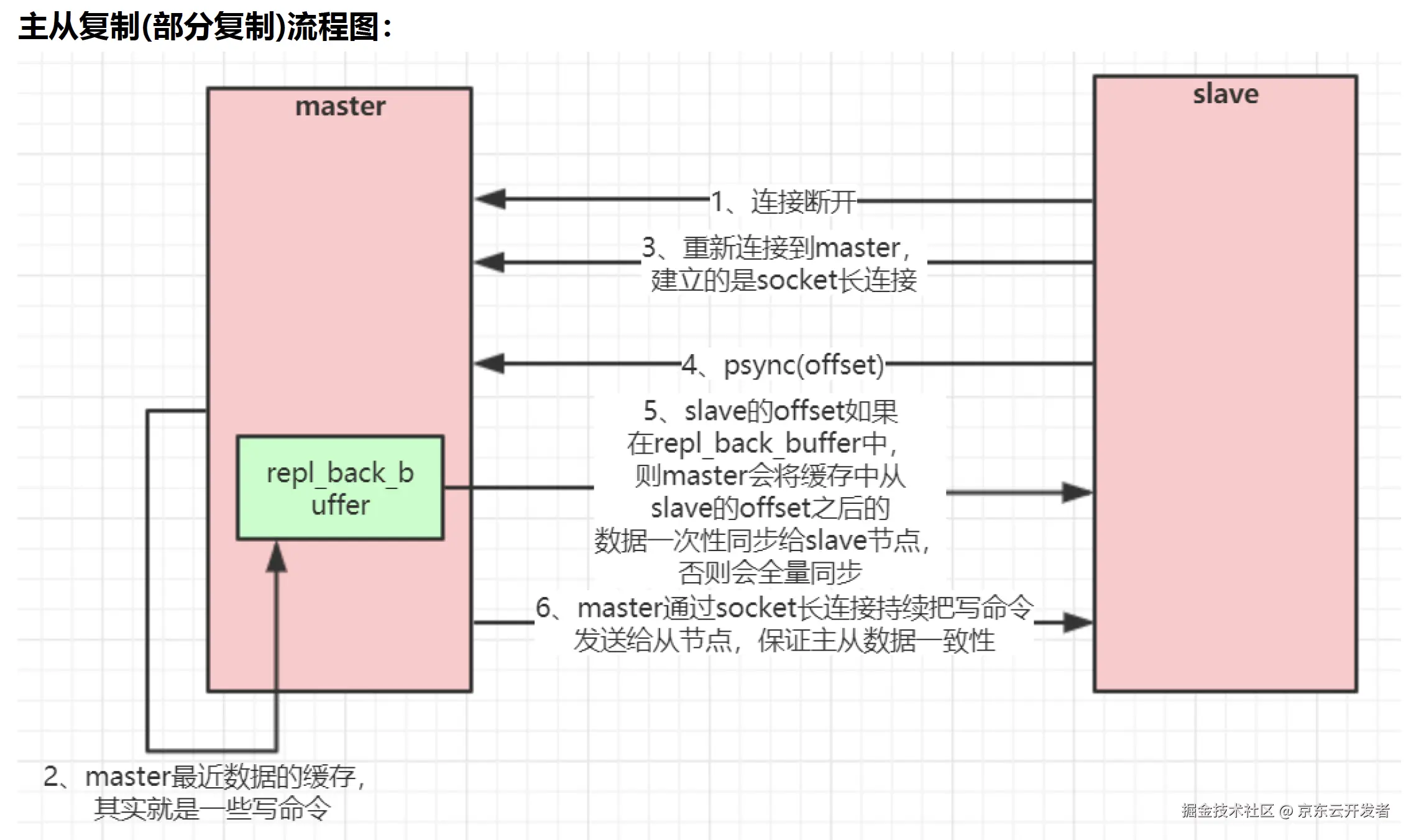 slave都维护了复制的数据下标offset和master的进程id,因此,当网络连接断开后,slave会请求master