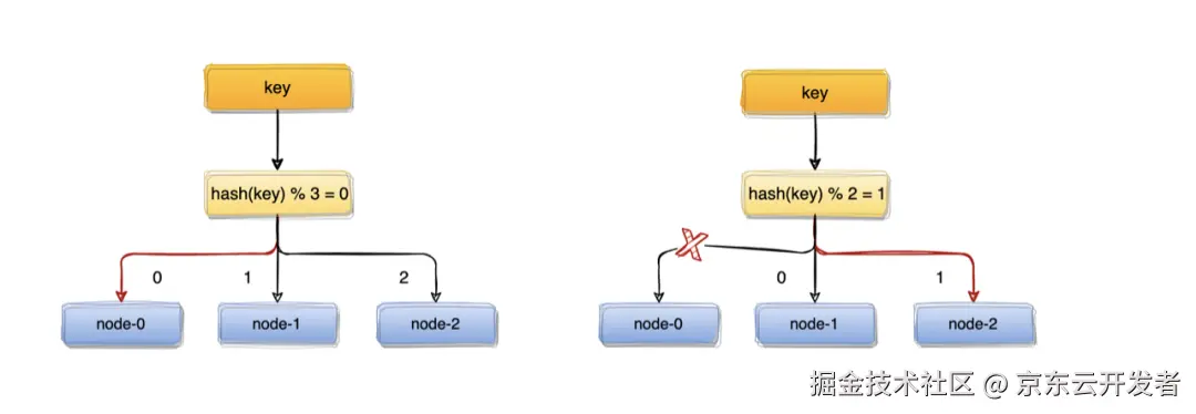 比如:一个服务器节点挂了,计算公式从hash(key)% 3变成了hash(key)% 2,结果会发生变化,此时想要访问一个key,这个key的缓存位置大概率会发生改变,那么之前缓存key的数据也会失去作用与意义。