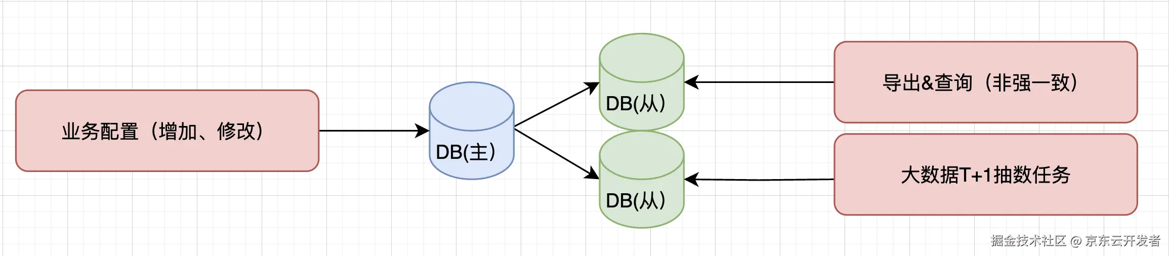 采用1主2从模式,业务配置写主库,可延迟的导出或者查询采用读从库。如果对配置一致性比较强,则读主库。从库另外一个作用是大数据抽数,晚上抽数任务运行,但不影响主库