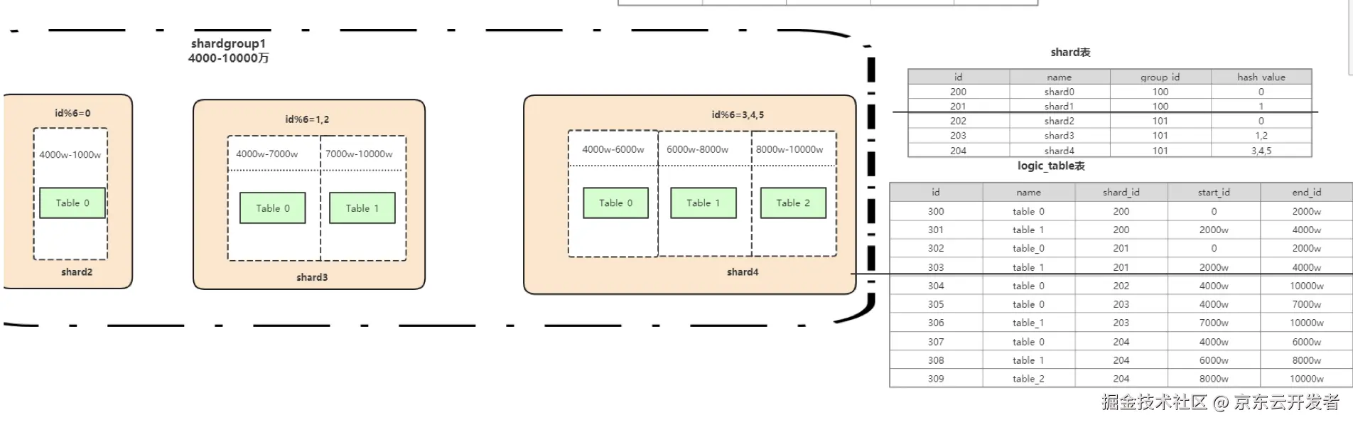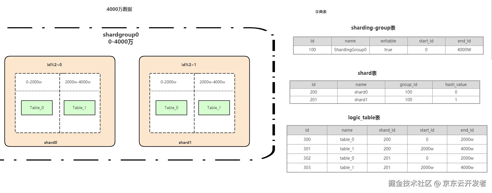 1)范围求模分片案例: 优点可以避免扩容时的数据迁移,又可以一定程度上避免范围分片的热点问题 1)比如数据库刚开始预估是4000W数据量,采用2个库shard0、shard1。里面分别有2张表Table_0,Table_1。通过idhash2分别对应不同shard0、shard1数据库库。里面数据量再通过范围比如0-2000w定位到Table_0,2000-4000w定位到Table_1.