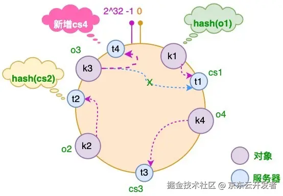此时,只有t1和t2服务器之间的部分对象需要重新分配。在以上示例中只有o3对象需要重新分配,即它被重新到CS4服务器。