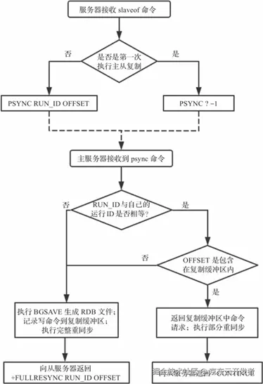 从上图可以看到,当主服务器判断可以执行部分重同步时向从服务器返回"+CONTINUE";需要执行完整重同步时向从服务器返回"+FULLRESYNC RUN_ID OFFSET",其中RUN_ID为主服务器自己的运行ID,OFFSET为复制偏移量。