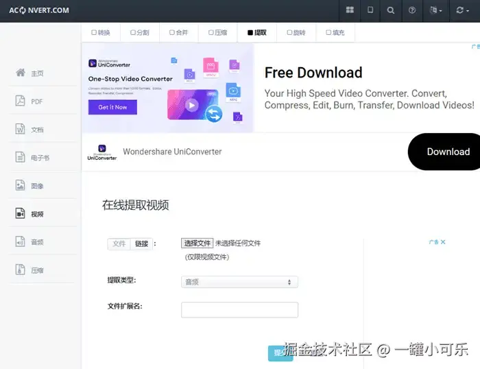 Aconvert是在线文件处理工具,支持音频提取免费操作。除此之外,还可以对音频进行转换、分割、合并、压缩、旋转、填充等操作。但是在操作的过程中会有比较多的广告弹窗,可能会误导用户误点,用户需要仔细甄别。下面是具体的操作步骤介绍。