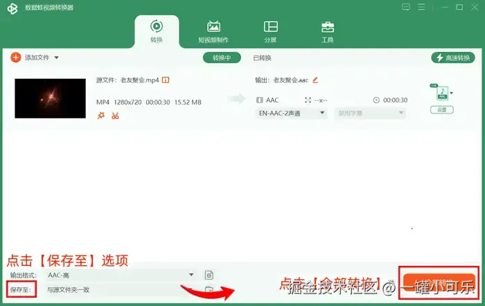 步骤3:返回格式转换界面,点击【输出格式】下方的【保存至】选项,选择音频导出的位置,然后点击【全部转换】即可。