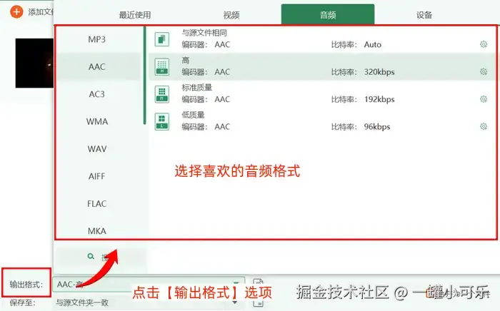 步骤2:点击【输出格式】选项,打开音频格式列表,选择喜欢的音频格式。