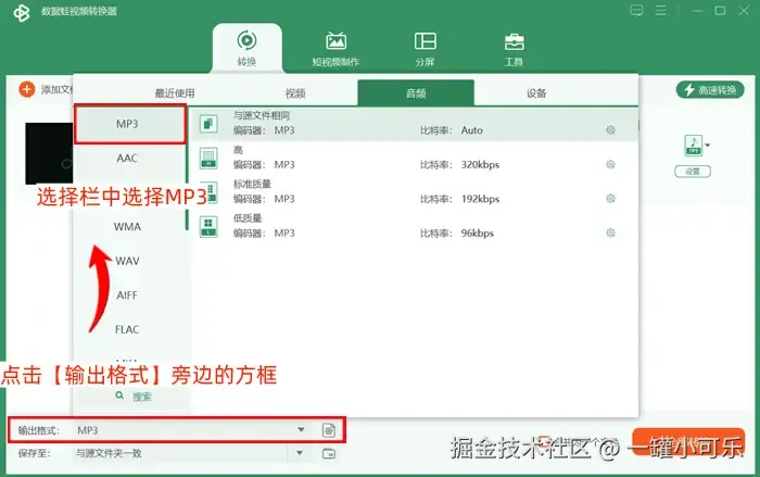 步骤2:点击左下方【输出格式】旁边的方框,进入格式选择界面后,点击【音频】按钮,在输出格式选择栏中选择MP3,可以点击界面右侧小齿轮图标设置比特率等相关参数。