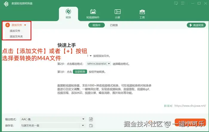 步骤1:启动数据 蛙视频转换器,点击【添加文件】或者【+】按钮,选择要转换的M4A文件。如果有批量转换需求,可以选择【添加文件夹】选项。