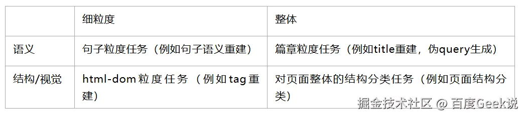 对于粗粒度的篇章预训练场景,结合搜索点击日志,mask掉title后,通过decoder去噪重建title以及生成用户点击的query。