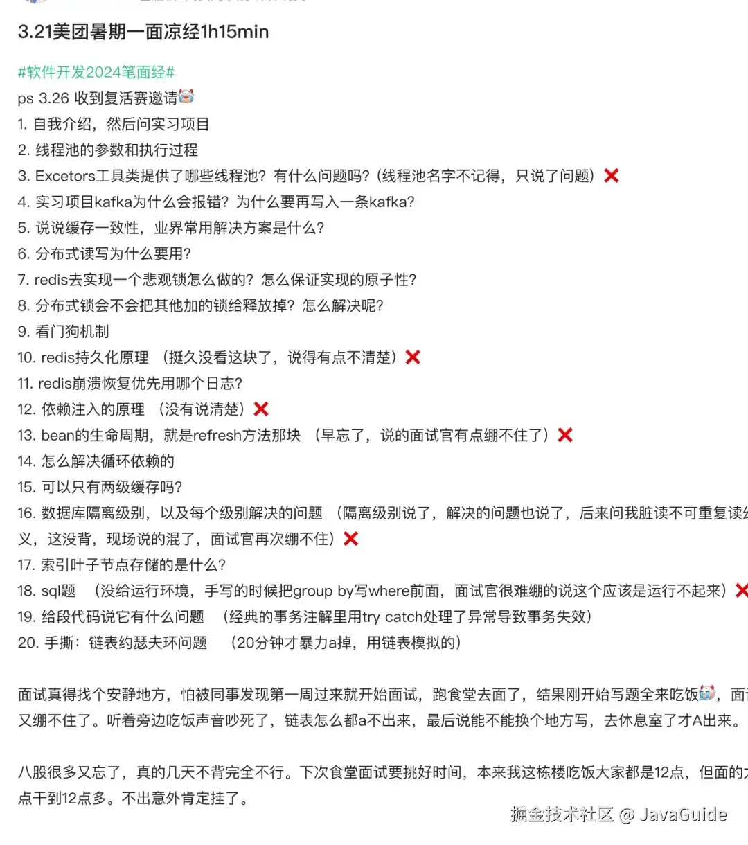 今天来分享的是一位读者的美团暑期实习一面面经,主要是一些常规八股,难度还是有的,部分题目确实不太好回答。