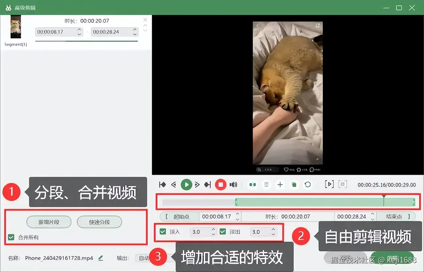 步骤3:录制完成后,我们可以点击进入 【高级剪辑】 中对视频进行后期编辑处理,如分段、剪辑视频,并可给视频增加特效。