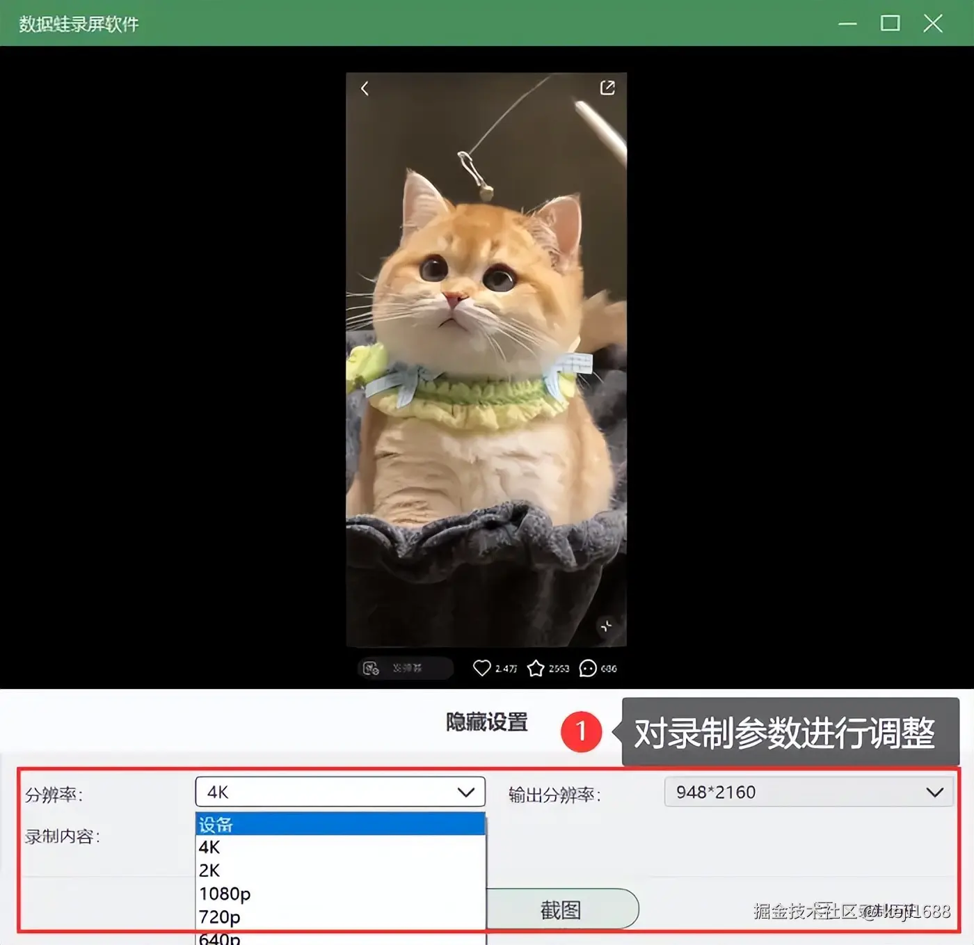 步骤2:连接成功后,将手机上的内容投屏到电脑上,对录制参数进行调整后点击 【录制】 即可记录下手机屏幕上的内容。
