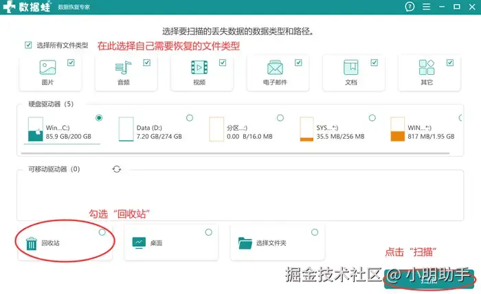 第1步: 打开软件,选择好需要恢复的文件类型和回收站,单击“扫描”;