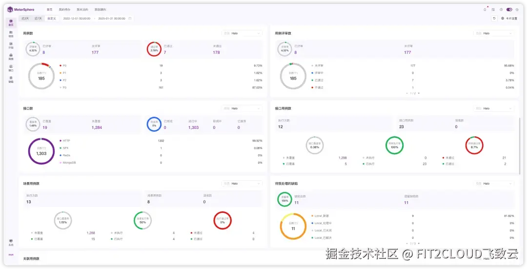 MeterSphere的工作台模块首页由不同的卡片组成,这些卡片展示了包含用例数、接口数和场景用例数等不同的数据。同时,这些数据也有着对应的统计指标,比如用例的评审率、接口的覆盖率以及执行通过率等。
