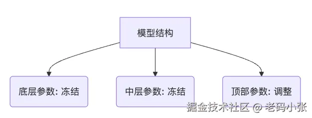 传统微调方法通常需要对模型的部分参数进行重新训练。常见的做法是“冻住”模型底层的大部分参数,只调整顶部几层(如下图所示),因为顶部更贴近任务目标: