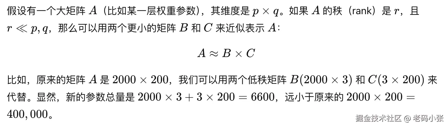 - 加速训练:因为低秩矩阵的计算更简单。