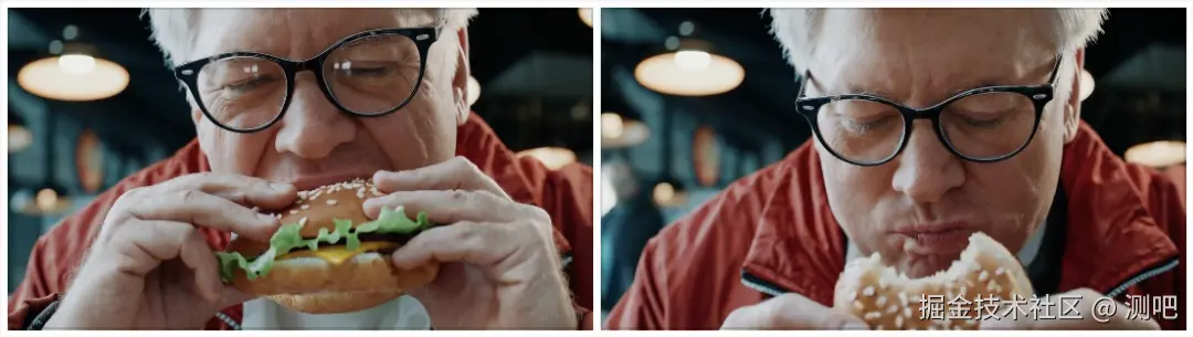 Sora 还可呈现出视频中物体的变化状态,如下图所示,在被咬过的汉堡上能够成功的出现咬掉的痕迹: