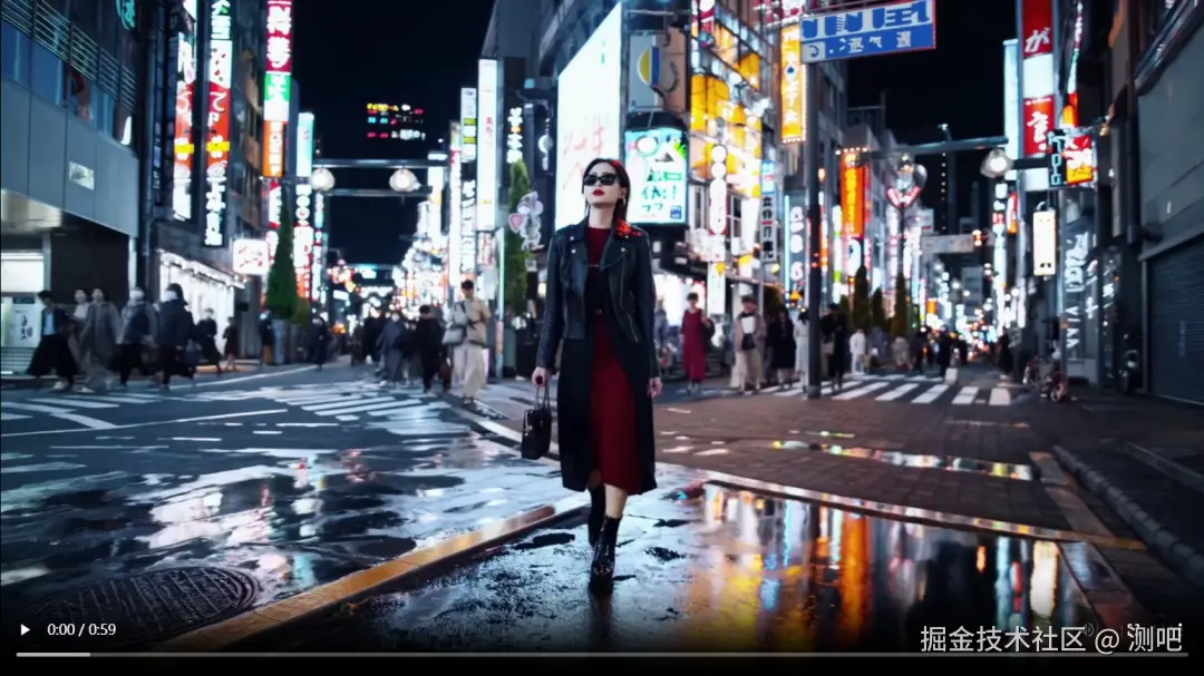 - 提示文本:一个时髦的女人走在东京的街道上,街道上充满了温暖发光的霓虹灯和生动的城市标志。她穿着黑色的皮夹克,红色的长裙和黑色的靴子。